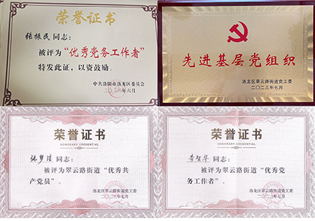 在洛龍區(qū)迎七一表彰大會(huì)上,支部書(shū)記張振民同志榮獲“洛龍區(qū)優(yōu)秀黨務(wù)工作者”榮譽(yù)稱(chēng)號(hào);在翠云黨工委慶祝建黨102周年暨“兩優(yōu)一先”表彰大會(huì)上,朝霞文化黨支部榮獲“先進(jìn)基層黨組織”榮譽(yù)稱(chēng)號(hào),支部委員李智華同志榮獲“優(yōu)秀黨務(wù)工作者”榮譽(yù)稱(chēng)號(hào),支部黨員張夢(mèng)潔同志榮獲“優(yōu)秀共產(chǎn)黨員”榮譽(yù)稱(chēng)號(hào),以上榮譽(yù)既是對(duì)支部及支部黨員同志當(dāng)下工作的認(rèn)可,更是對(duì)未來(lái)提出的要求,指引著支部及支部黨員同志再接再厲,再創(chuàng)佳績(jī)。